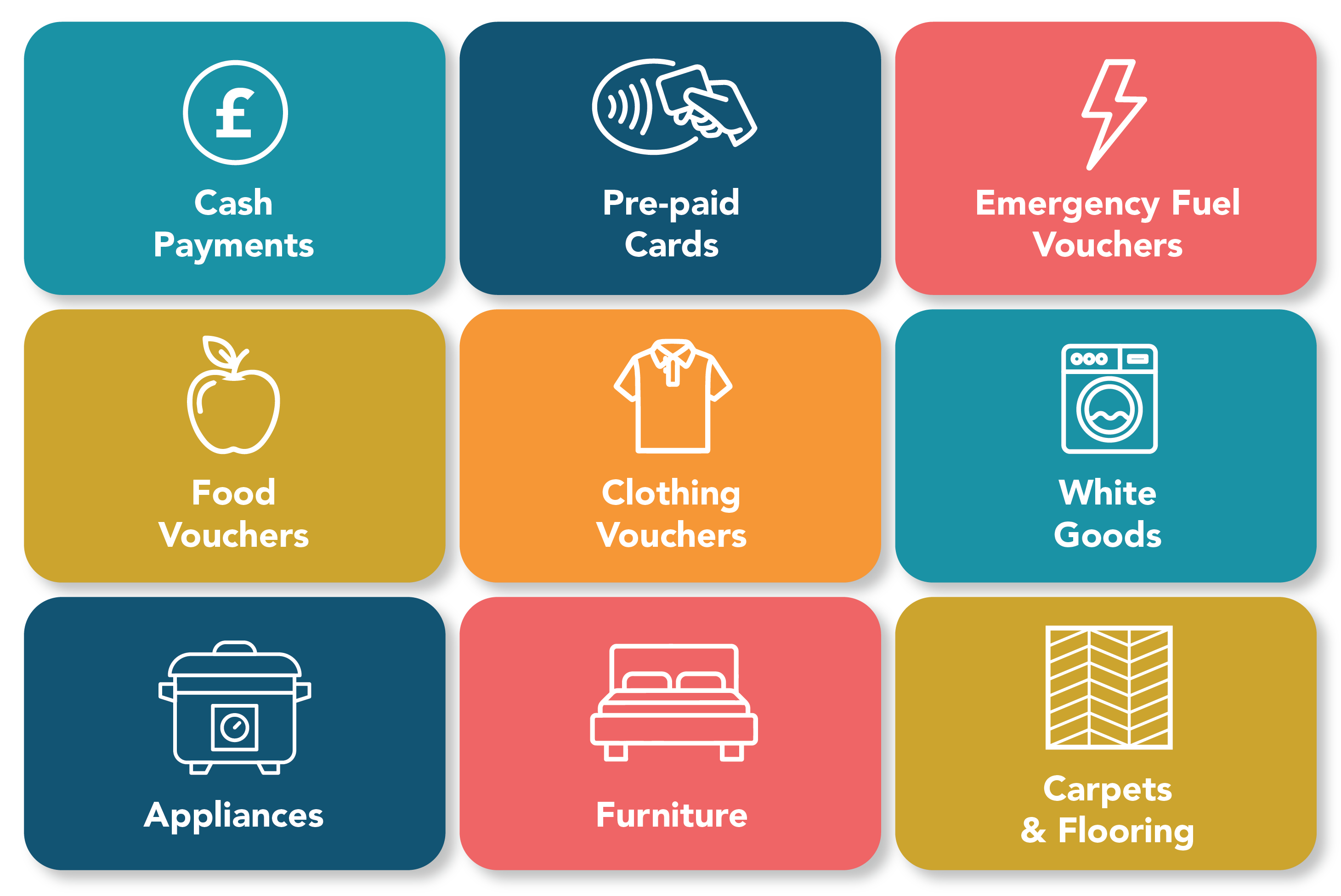 Absolutely! We are able to tailor our support services to the needs of your organisation. We can provide fulfilment services through our dedicated portal, meaning you can select from a range of support including cash, vouchers, household goods and white goods.